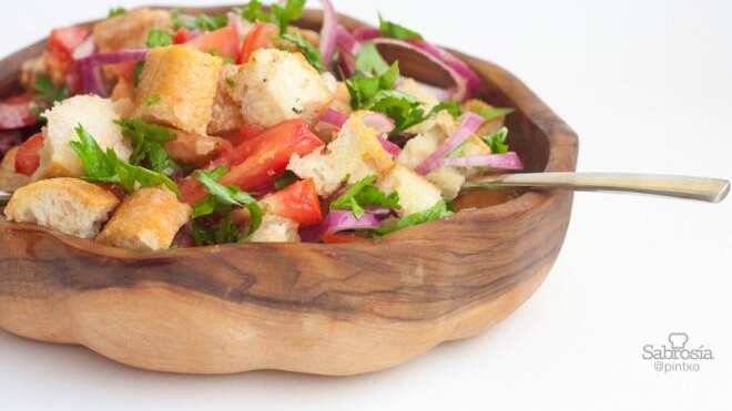 Sí, el ingrediente estrella es el pan duro, aunque hoy se elabora con pan del día siempre que sea compacto, como por ejemplo el pan de chapata que hemos utilizado en esta ocasión. Los ingredientes básicos son el tomate, la cebolla y el pan. Después se le puede añadir muchos otros ingredientes.