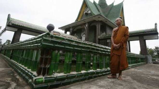 Wat Pa Maha Chedi Kaew, también conocido como Wat Lan Kuad (el templo del millón de botellas), se encuentra en Tailandia. Con la ayuda de los ciudadanos y autoridades locales, estos monjes comenzaron a recolectar botellas de cerveza desde 1984, con las cuales ya han construido el templo, casas, baños, el crematorio y también mosaicos de Buda hechos con las tapas de las botellas desechadas.