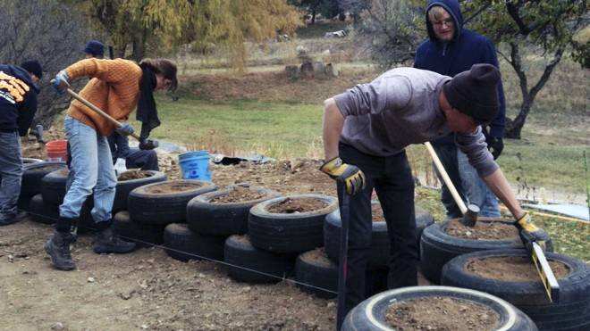 Todos los días tenemos actividades diferentes pues llevamos 3 obras al mismo tiempo. Estamos construyendo el techo y la fachada en una casa y los interiores de otra; ambas se encuentran en el Earthship. Además de los muros en la casa de uno de los clientes del arquitecto Michael Reynolds que se encuentra en las montañas. Así que a veces a algunos les toca cortar madera, a otros colocar llantas o latas, a otros martillar o atornillar, a otros cortar botellas, a otros preparar mezcla, a otros armar estructuras, a otros acabados finales, a otros acarrear material y a los más afortunados estar en interior.