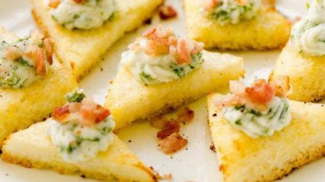 Cómo hacer tostaditas de polenta, queso ricotta y tocino