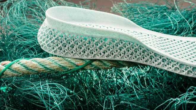 La parte blanca de la zapatilla es de tereftalato de polietileno, un tipo de plástico que se utiliza para botellas de plástico o textiles y para el resto del diseño (parte verde-azulada) se usa mallas de pesca.