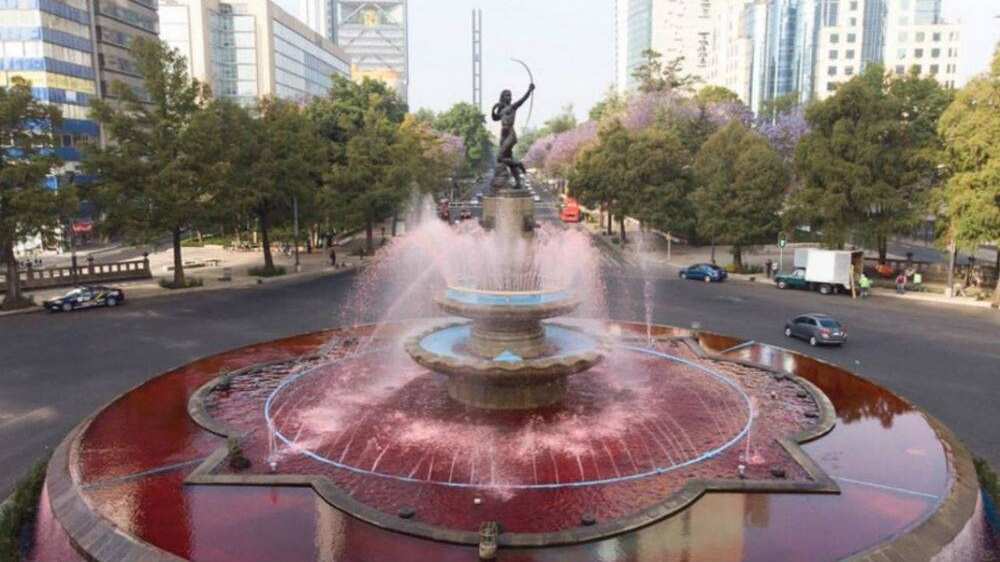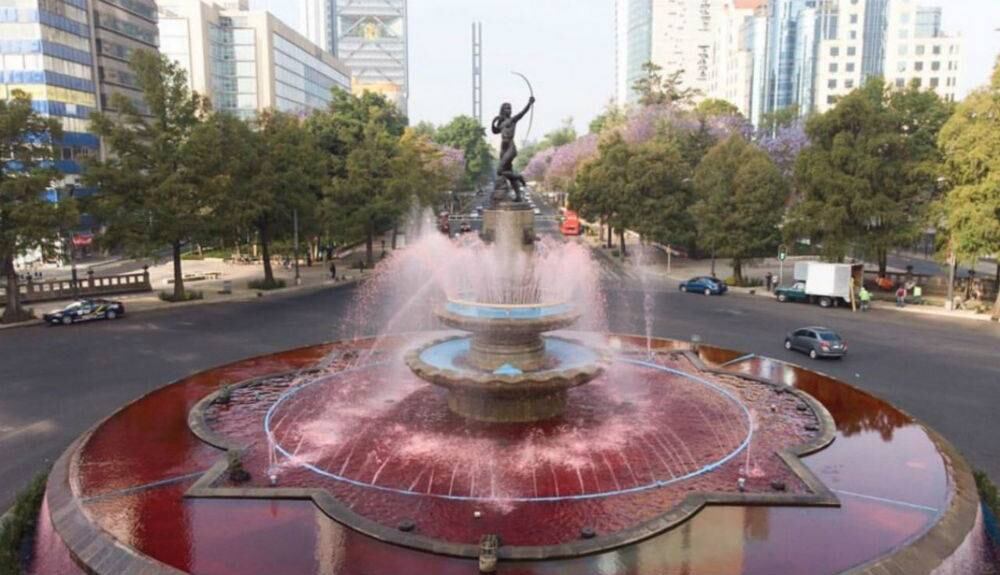 Este sábado el agua de la fuente de la Diana Cazadora se tiñó de rojo en representación de las 10 mujeres que son víctimas de feminicidio en México.