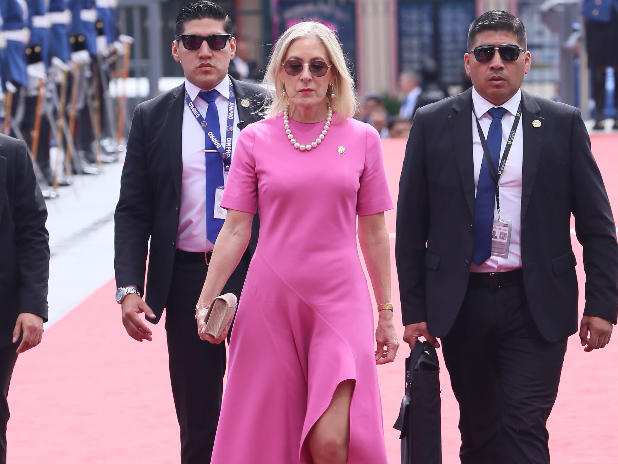 Por su parte, la asambleísta Annabella Azín, madre del presidente electo, optó por un llamativo y apropiado vestido en un tono rosa vibrante. Su elección destacó en la alfombra de la Asamblea, transmitiendo una energía particular.