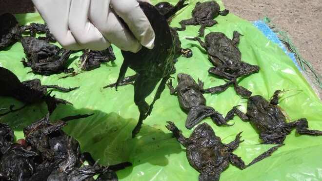 Autoridades del gobierno peruano investigan la muerte de al menos diez mil ranas gigantes en el río Coata, que desemboca en el Lago Titicaca, en la frontera con Bolivia.