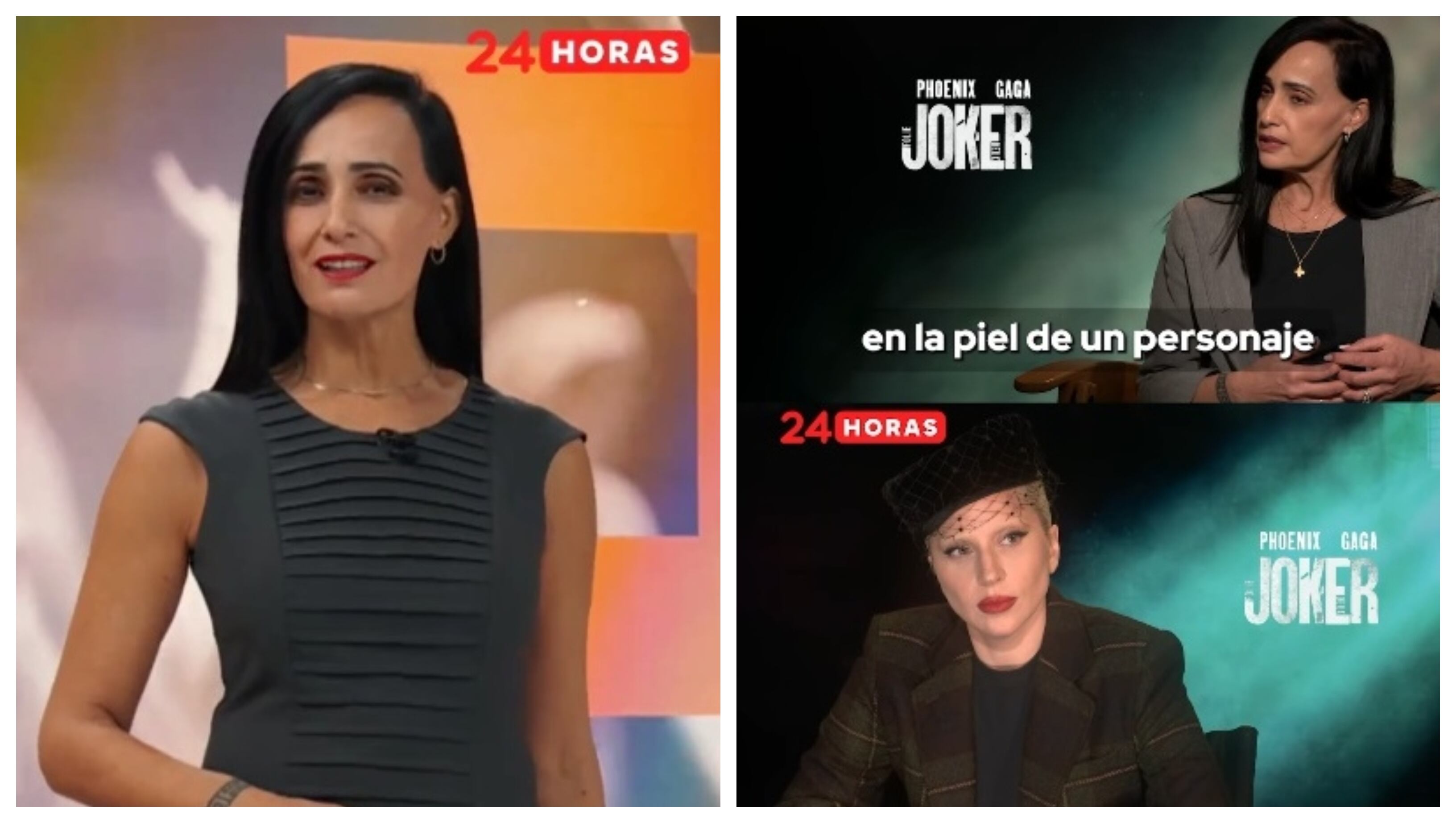 Carolina Gutiérrez entrevistó a la cantante Lady Gaga por el nuevo filme de Joker.. Fuente: Capturas de pantalla programa "24 Horas", de TVN.