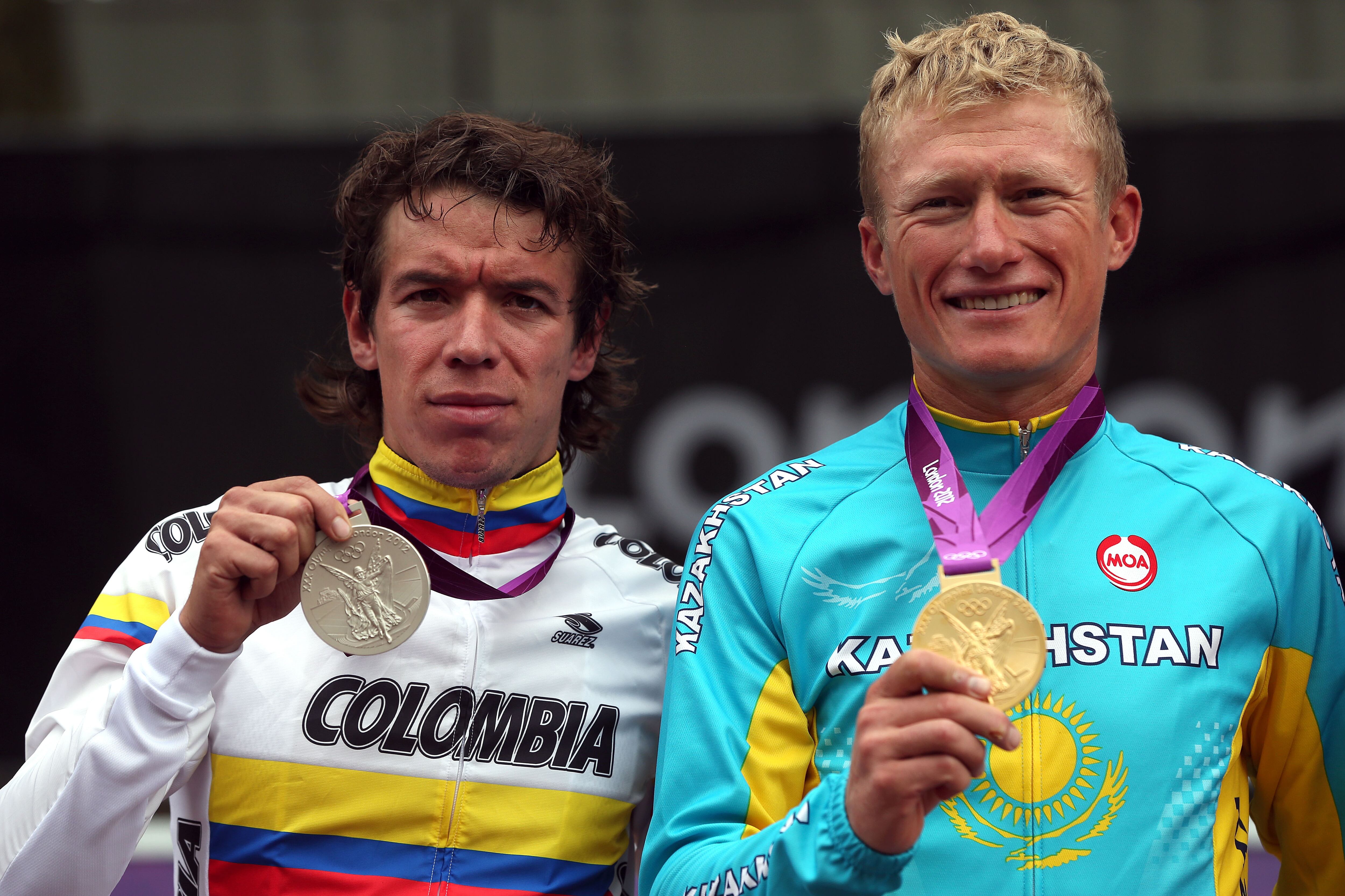 Rigoberto Urán LONDON, ENGLAND - JULY 28: (L-R) Silver medallist Rigoberto Uran Uran of Colombia and gold medallist Alexandr Vinokurov of Kazakhstan celebrate during the Victory Ceremony for the Men's Road Race Road Cycling on day 1 of the London 2012 Olympic Games on July 28, 2012 in London, England. (Photo by Bryn Lennon/Getty Images) (Bryn Lennon/Getty Images)