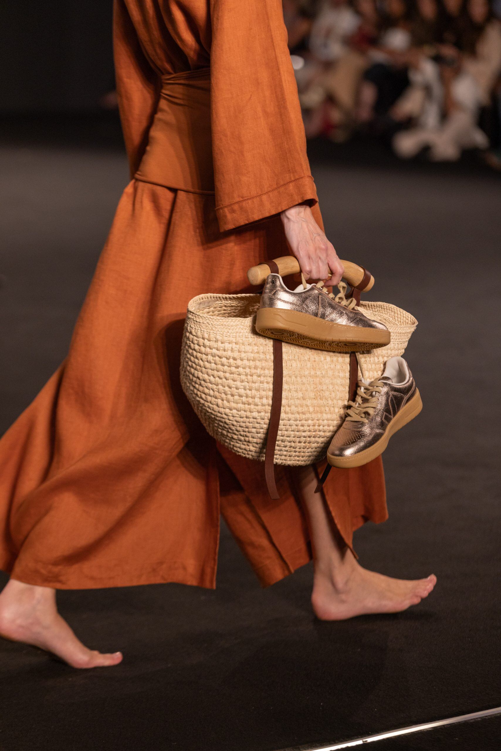 Los accesorios, como sombreros y bolsos de paja, acompañados con collares creados por Mónica Cuza, y los tenis VEJA de origen franco-brasileño, intervienen con materiales ecológicos como el caucho silvestre del Amazonas y el algodón orgánico. Con un enfoque claro en la sostenibilidad, esta alianza fue impulsada por la multimarca Malva en el escenario global americano.