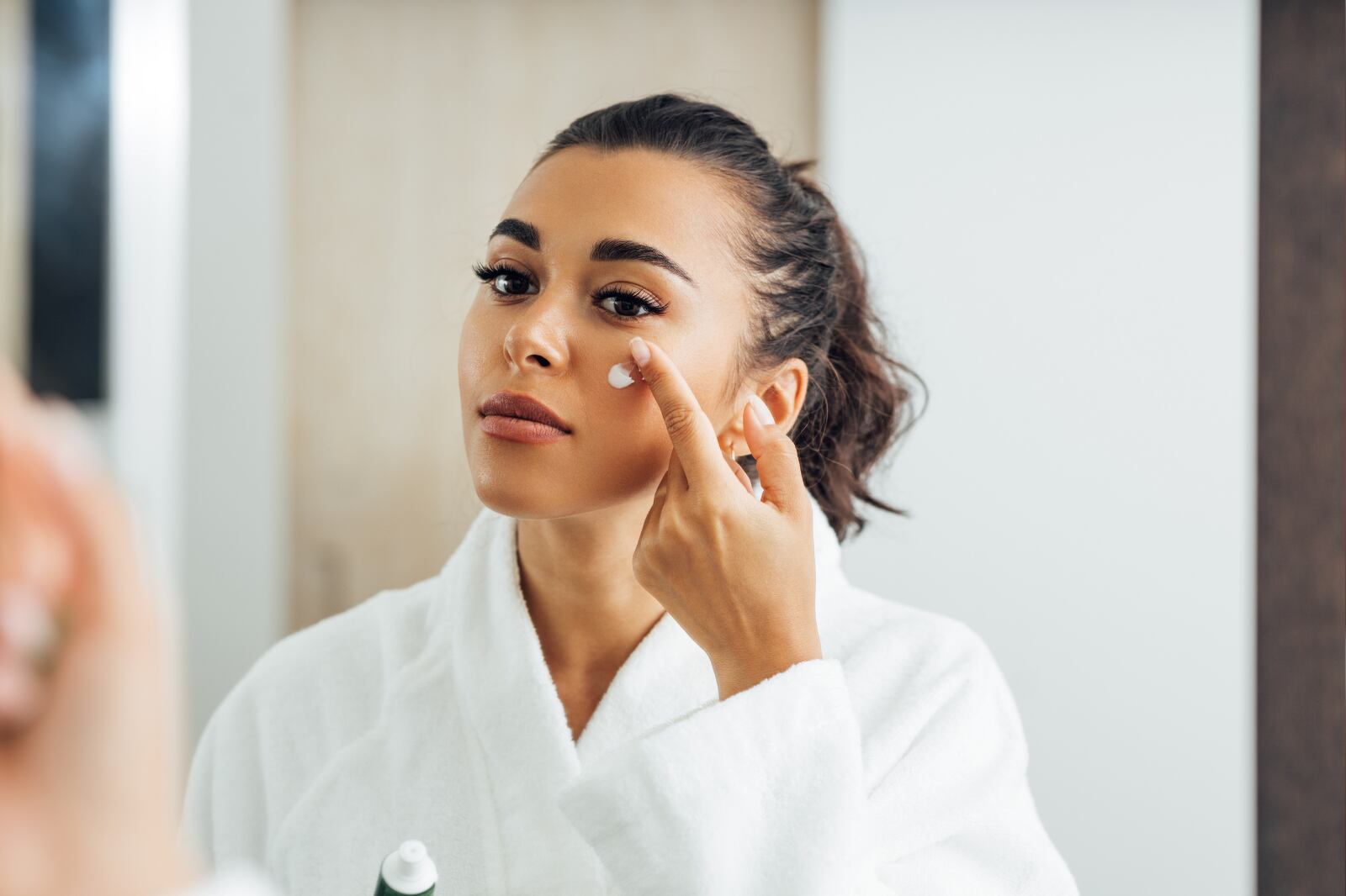 Utiliza productos enfocados como contorno de ojos, sérums y sobre todo, no olvides el protector solar, ya que es la mejor crema antiedad que podrás encontrar. Siempre lava tu rostro, luego aplica un sérum con ingredientes activos, hidrata y, por último, aplícate el bloqueador. Después, usa tu maquillaje habitual.