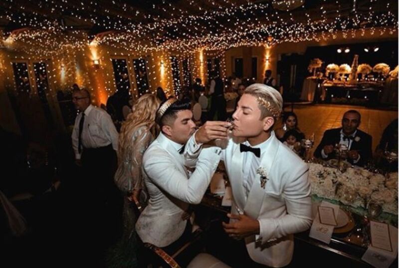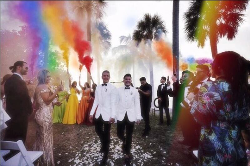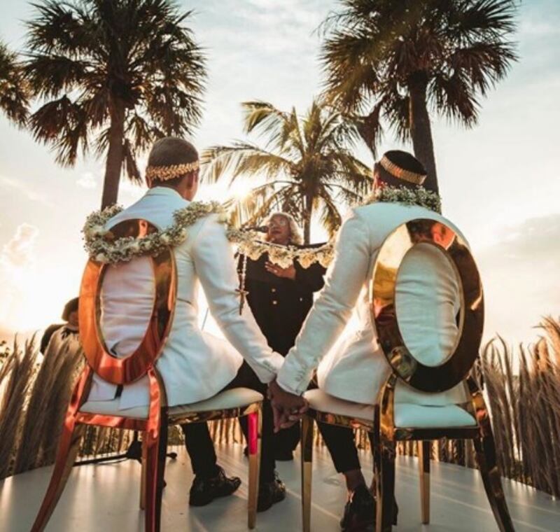 Las madres de ellos las acompañaron hasta un altar improvisado frente al mar y acompañado con la caída del sol. Fue un evento muy emotivo y publicado en historias y post de redes sociales de los invitados.