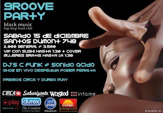Un excelente DJ Line Up con C Funk y Sonido Acido, en un imperdible set de Black Music estarán ahí para hacerte explotar. Power Peralta, los mejores Hip Hop Dancers del país se despiden de Chile para volar a Los Angeles con un espectacular show en vivo. Circa y Durex Play te premiarán en entretenidos concursos. Todo esto podrás disfrutarlo más áun en el ambiente VIP que te recibirá con Sushi Infame y un cover, haciendo que esta fiesta sea el mejor panorama para este fin de Semana.