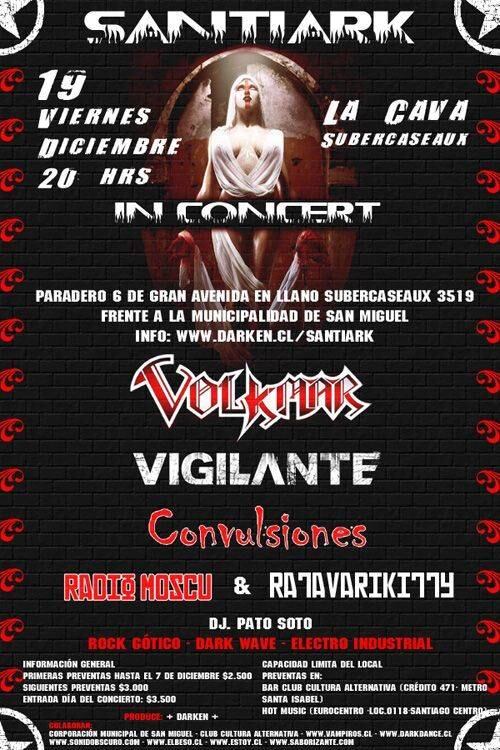 Volkmar, banda Australiana, El año pasado se presentaron en Blondie y quedaron tan encantados con nuestro país, prometieron volver y están en gira para presentar su álbum “Blessed Sins” y traer a Chile el show que llevaran al reconocido festival internacional Wave Gotik Treffen 2009. Volkmar dedica sus canciones exclusivamente a los siete pecados. Disfrute de la oscuridad.