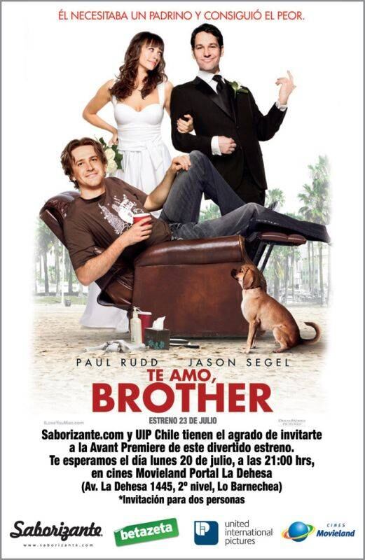 En “Te amo, Brother” (I Love You, Man), una comedia de John Hamburg (“Mi Novia Polly,” co-escritor de “Los Padres de mi Novia”, “Los Padres de mi Novia 2” y “Zoolander”), Peter Klaven (Paul Rudd, “Ligeramente Embarazada” y “Virgen a los 40”) es un exitoso agente inmobiliario quien, a punto de comprometerse con la mujer de sus sueños, Zooey (Rashida Jones, “The Office”), descubre, a su pesar y para su disgusto, que no tiene un amigo hombre suficientemente cercano para que sea su Padrino de boda.