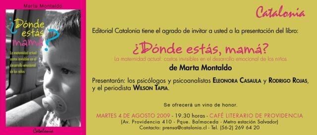 En ¿Dónde estás, mamá? (Editorial Catalonia) Marta Montaldo se propone transmitir las enseñanzas que su labor como parvularia y dueña de un jardín infantil le han brindado durante más de cuatro décadas. Sumado a esta experiencia, la autora revisa en profundidad el modo en que se ha abordado e implementado en Chile el cuidado de los niños a partir del Sistema de Protección de la Infancia propuesto por el Estado. Basándose en el entendido de que una “sociedad sana no es más que la multiplicación de individuos sanos”, Montaldo propone reevaluar los criterios etarios y las formas de aplicación de los sistemas educativos implementados por dichos programas.
