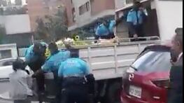 La comerciante se resiste a permitir que los uniformados se lleven todas las flores que vendía en una calle de la capital y se observa que forcejea con ellos.