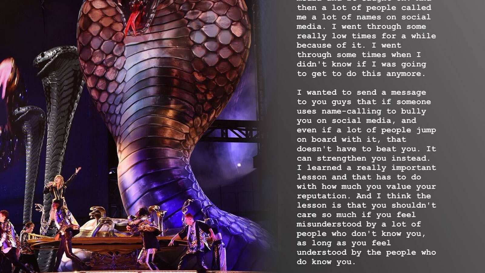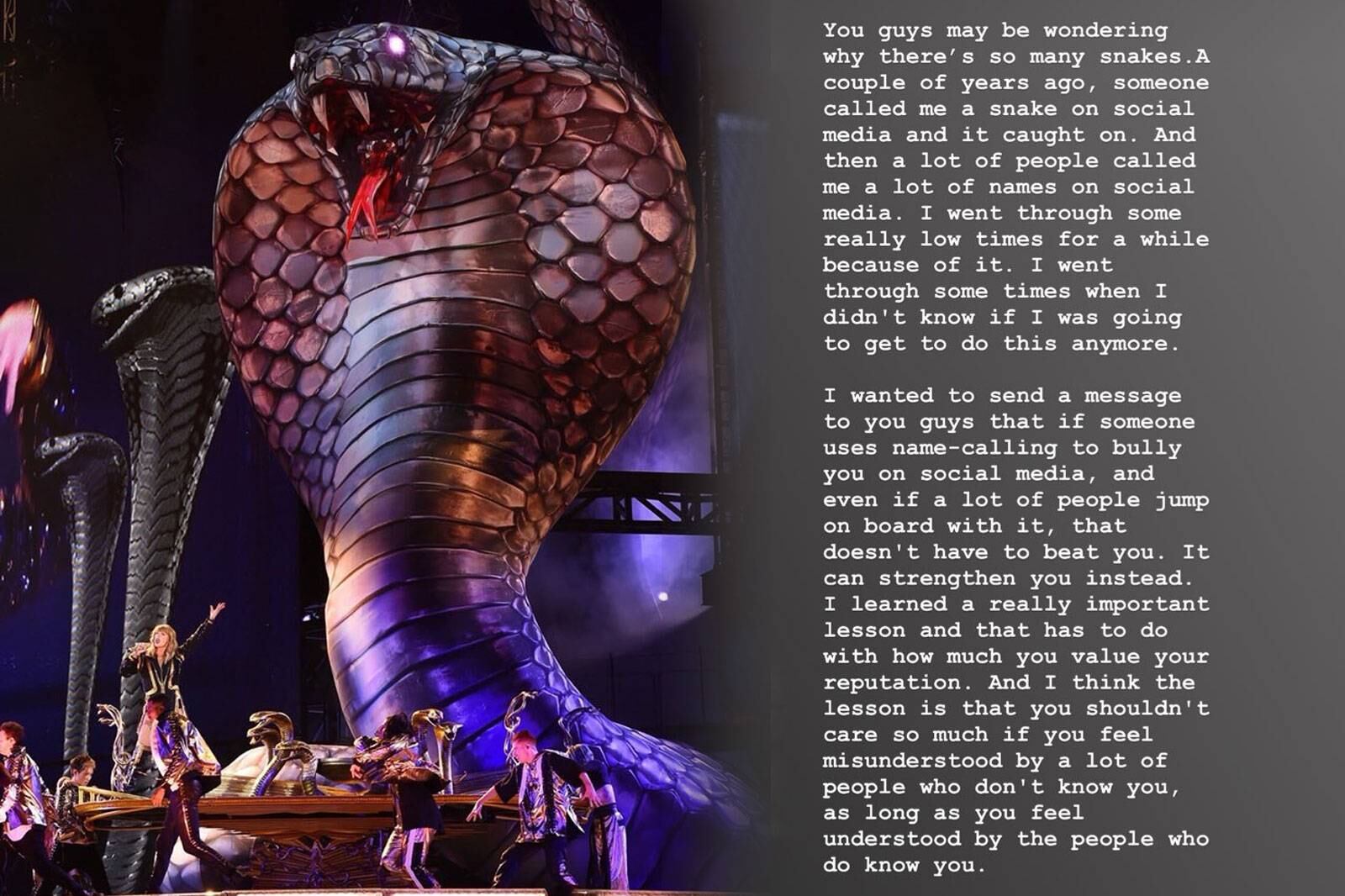 «Ustedes se estarán preguntando porqué hay tantas serpientes en el escenario. Hace un par de años, alguien me llamó serpiente en las redes sociales y desde ahí se engancharon. Mucha gente más empezaron a ponerme nombres desagradables en las redes sociales. Pasé un tiempo realmente con los ánimos bajos por culpa de eso. Incluso llegué a dudar si podía seguir haciendo esto. Por eso quiero enviarte un mensaje a ti, si alguien usa algún sobrenombre para intimidarte en las redes sociales, e incluso si mucha gente se suma a eso, tienes que recordar siempre que eso no tiene por qué derribarte. En su lugar, puede fortalecerte. Aprendí una lección realmente importante y tiene que ver con cuánto valoras tu reputación. Creo que la lección es que no deberías preocuparte tanto si te sientes incomprendido por muchas personas que no te conocen, siempre y cuando te sientas comprendido por las personas que te conocen».
