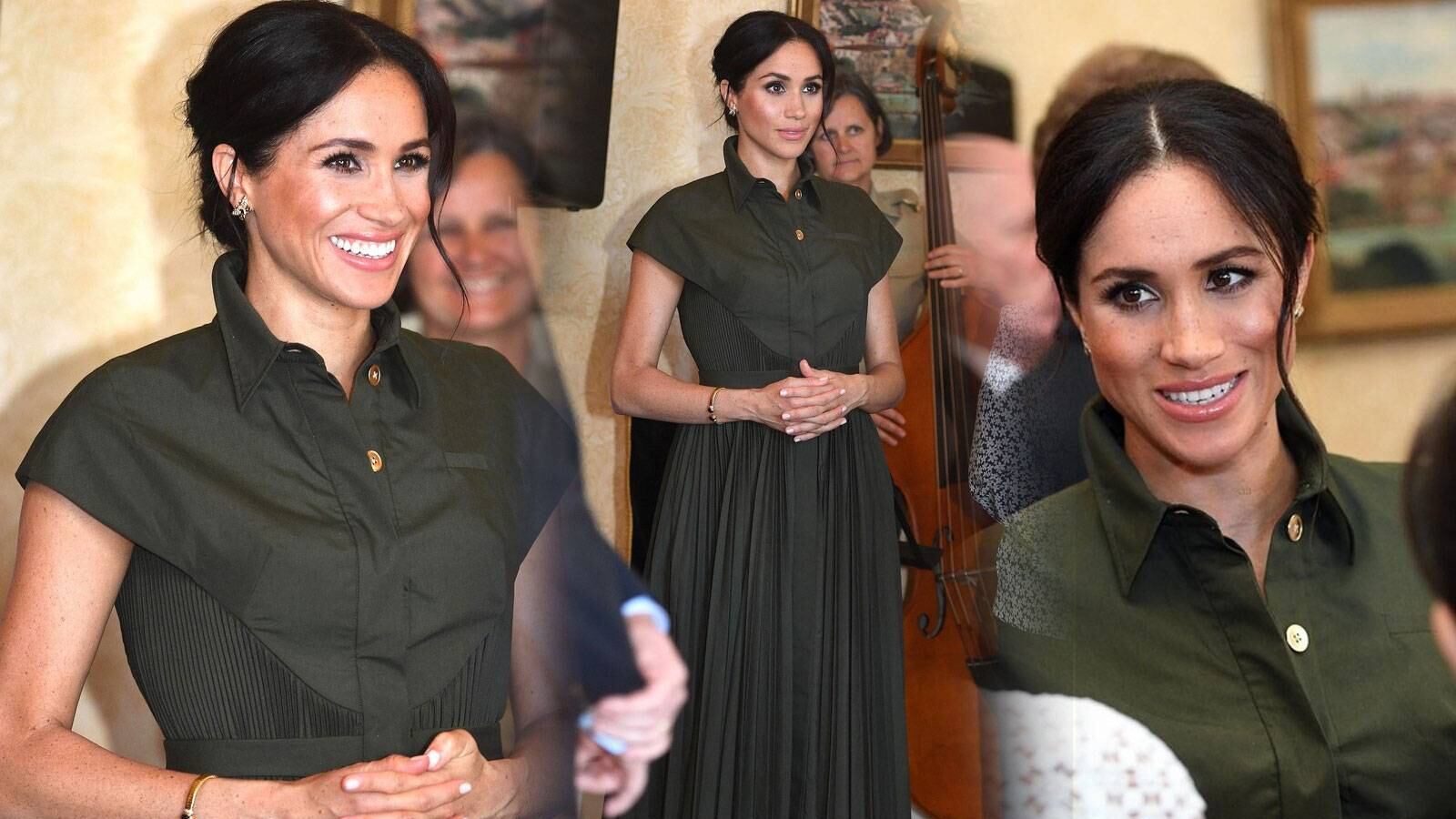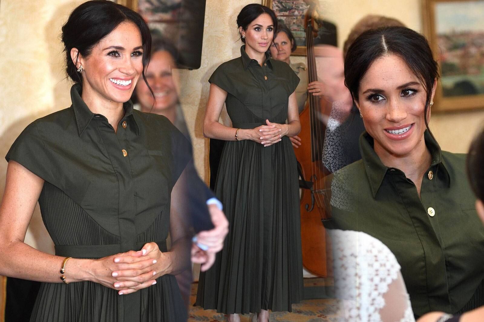 Durante el evento, lo que más sorprendió a los presentes, fue el look de la futura mamá. Meghan escogió un vestido verde oliva de Brandon Maxwell. Con plises y con una textura a lo largo de su falda, se convierte en el look más fresco y relajado que ha escogido hasta ahora la duquesa para mostrar su embarazo.