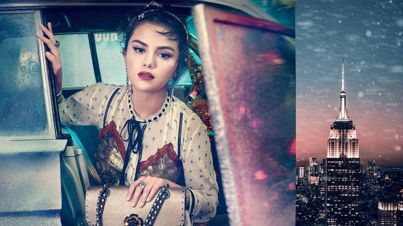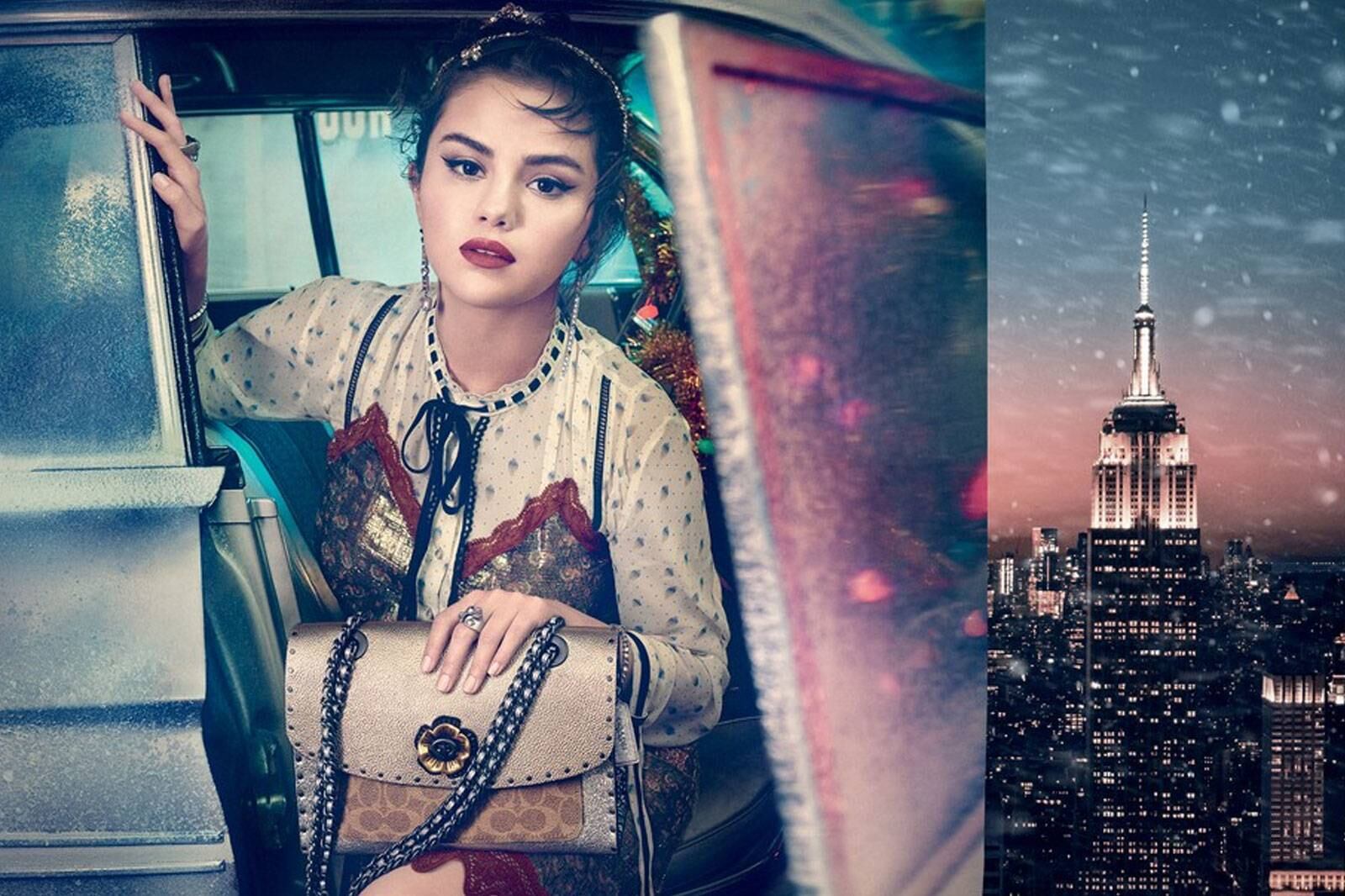 La interprete de éxitos como ‘Back To You’ o ‘Kill ‘em with kindness’, con apenas 26 años, es el rostro mundial de la línea de ‘Coach Women’ en la campaña que se titula «Lights, Camera, Holiday» que precisamente se estrenó el viernes 02 de noviembre. La campaña se desarrolla en contraste con el brillante horizonte de Nueva York, mostrando a Selena saliendo muy glamorosa de un vehícula de época mientras sostiene la bolsa Parker, diseñada en cuero metálico.