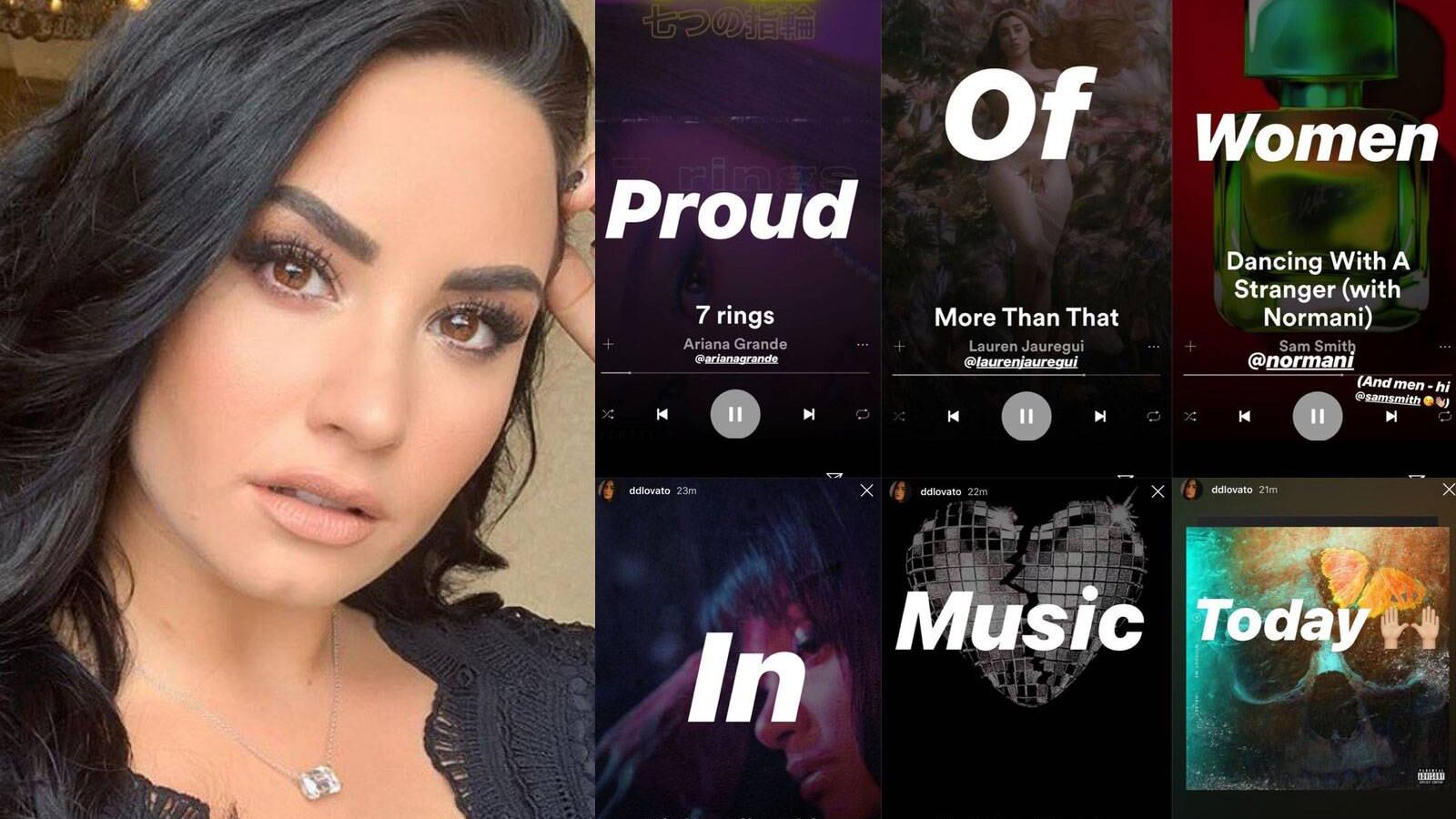 Demi Lovato praises @ArianaGrande, @LaurenJauregui, @Normani, @Kehlani, @MileyCyrus, and @Halsey for their music in a series of Instagram stories: