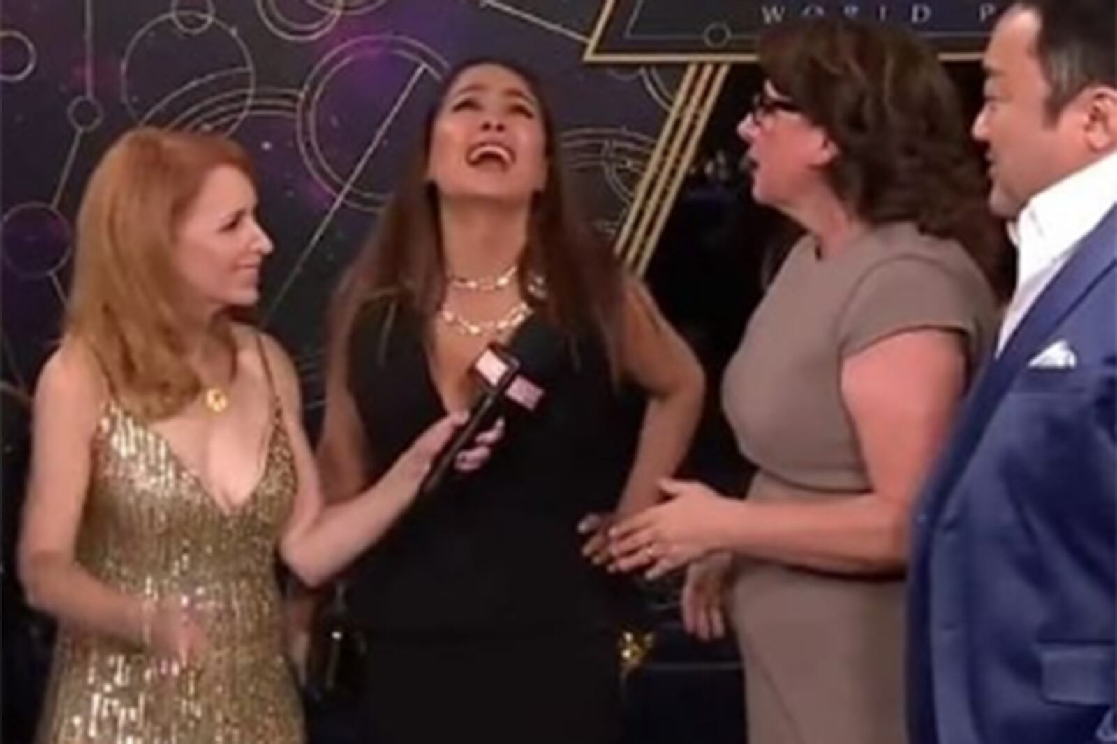 Una vez que ellas usaron su lengua natal, la vicepresidenta de Marvel se dirigió a los reporteros muy emocionada para llenar de halagos a sus actrices quienes hicieron un rol impactante en esta trama, pero ésta es interrumpida por Hayek quien señala que ellos no hablaban español. Ante esto Victoria Alonso respondió de forma inesperada: “¡A mí no me interesa, que aprendan todos!”.