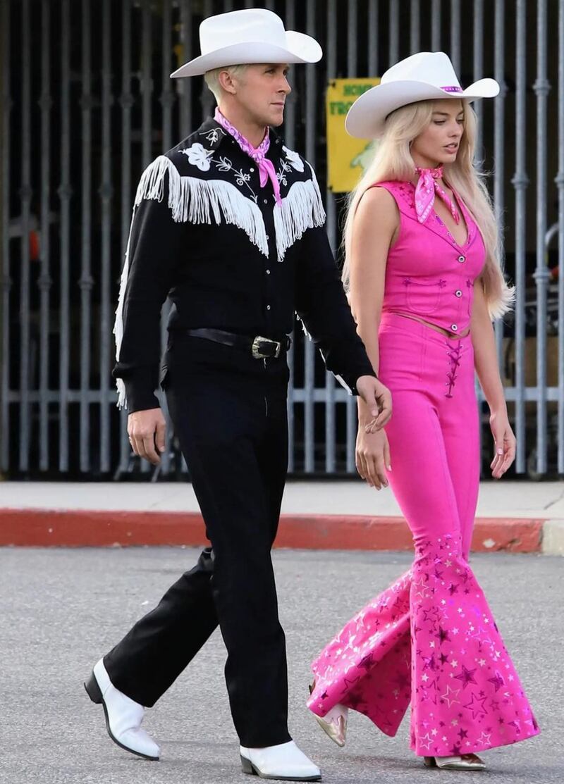 Margot Robbie y Ryan Gosling lucen muy contentos grabando la cinta de “Barbie”