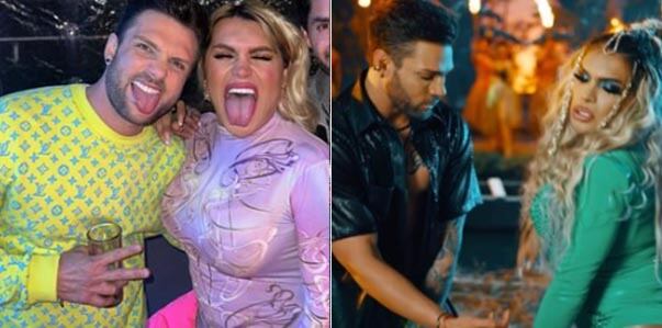 En el video se ve al influencer con una camiseta negra con hoyos y transparencias y un pantalón negro y a la celebridad con un look de cuero y bodysuit con el cabello largo y con ondas.