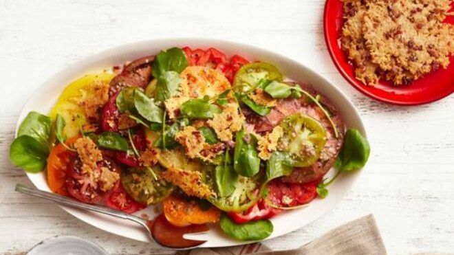 Cómo preparar la ensalada de tomates con chips de tocino y queso