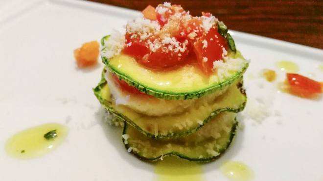 Tomamos 4 platos para entrantes y en el centro ponemos una rodaja de calabacin, una rodaja de queso mozzarella, algunas de tomates pachino, un poco de sal y un poco de aceite…naturalmente un poco de albahaca cortadas con las manos. Hacer lo mismo por 3 capas como máximo. Terminar con una rodaja de calabacin, cubitos de tomates pachino, un poco de albahaca y un poco de queso parmigiano autentico….un chorrito de aceite y listo.