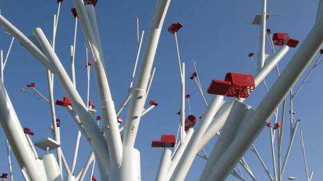 Motivados por un concurso del Ministerio de Obras Públicas, los arquitectos Claudio Magrini y Emilio Marín -asesorados además por una ornitóloga- instalaron en la autopista a Chicureo un bosque de árboles de metal equipados con pequeñas casas y accesorios que buscan atraer a pájaros en migración.
