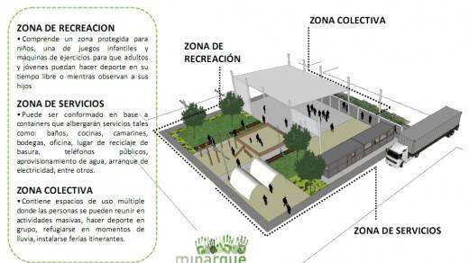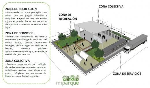 Basándose en esta realidad, la propuesta de MiParque busca formalizar y potenciar este nuevo uso generando una estrategia de módulos en cada zona afectada para cumplir una serie de funciones: recreación, prestación de servicios y zonas techadas para aumentar las posibilidades de realizar actividades con distintas situaciones climáticas. La escala de estas intervenciones puede ir desde los 1000 a los 2000 metros cuadrados y sus valores dependiendo si se ubican en las zonas de emergencia o en espacios públicos existentes van desde los 25 a 35 millones de pesos, pudiendo beneficiar cada uno a más de 200 familias.