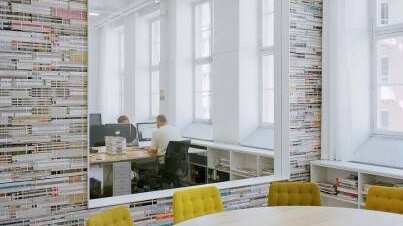 La agencia de publicidad sueca Oktavilla estuve pensando qué hacer con las montañas de revistas que tenían acumuladas en sus bodegas y, en vez de tirarlas a la basura, decidieron reutilizarlas y convertirlas en las paredes de sus nuevas oficinas. La gracia es que queda rápidamente un bonito diseño y da un aislamiento término y acústico de los mejores que se pueden encontrar.