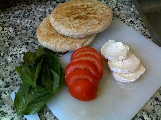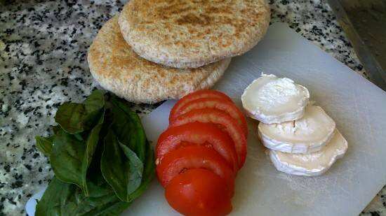 El primer picoteo es muy fácil de hacer. La idea es hacer unas especies de brochetas, para lo que se necesitan moldadientes para insertar los ingredientes. Primero hay que trozar el queso de cabra en cuadrados y ponerlo en los palitos. Luego poner una hoja de albahaca entremedio y finalizar con el tomate cherry.