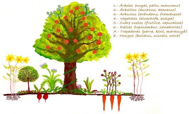 Podemos observar coexistiendo conjuntamente árboles, arbustos, enredaderas y vegetales, todas potenciales fuentes de alimento. Dependiendo del diseño y condiciones del lugar es como se manifestarán estas capas.