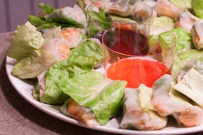 Serviremos nuestros rollitos vietnamitas rellenos de gambas con algunas salsas. Por ejemplo agridulce, o salsa de chile, o salsa de soja, o tamari, etc. La verdad que combinan muy bien con cualquier tipo de salsa asiática.
