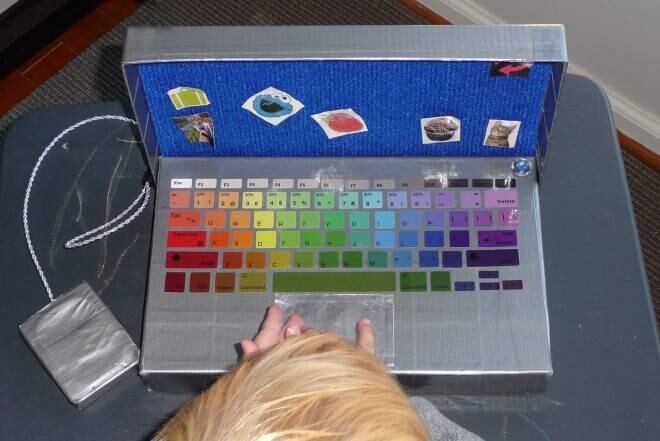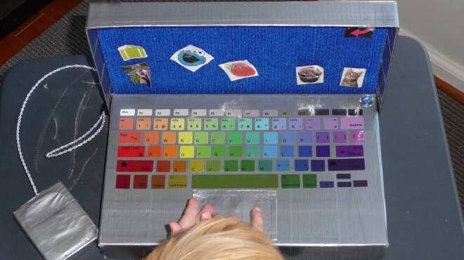 - También puedes fabricarles juguetes, como el computador de cartón echo con tapas de caja de zapatos que aparece arriba, o como este entretenido cuando didáctico de acá abajo.