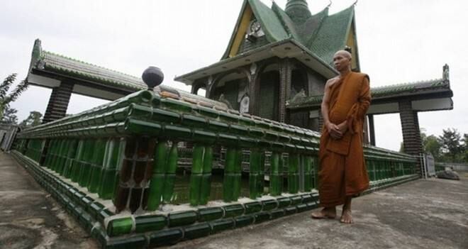 Wat Pa Maha Chedi Kaew, también conocido como Wat Lan Kuad (el templo del millón de botellas), se encuentra en Tailandia. Con la ayuda de los ciudadanos y autoridades locales, estos monjes comenzaron a recolectar botellas de cerveza desde 1984, con las cuales ya han construido el templo, casas, baños, el crematorio y también mosaicos de Buda hechos con las tapas de las botellas desechadas.
