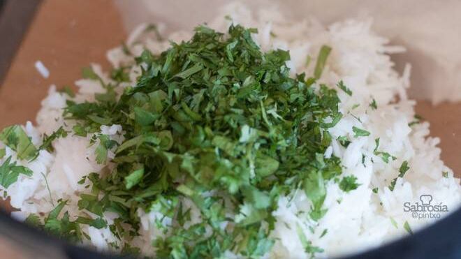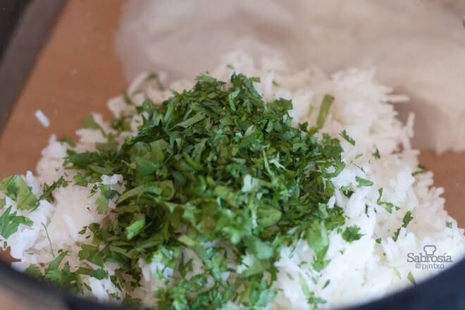 A parte tostamos ligeramente en una sartén sin aceite el cilantro y el comino y lo mezclamos cuando el arroz ya esté cocido.