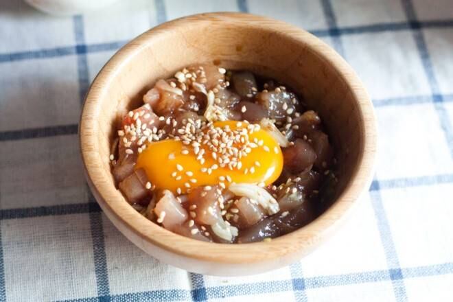 Añadimos la salsa de soja, el aceite, y volvemos a mezclar. Por último ponemos las yemas de huevo encima.