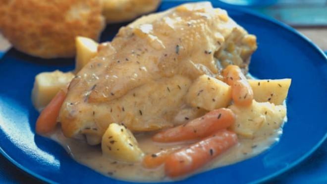 Para servir, coloca el pollo y las verduras en un plato para servir. Revuelve la crema agria en la salsa que quedó en olla con un batidor de alambre. Vierte sobre el pollo y las verduras.