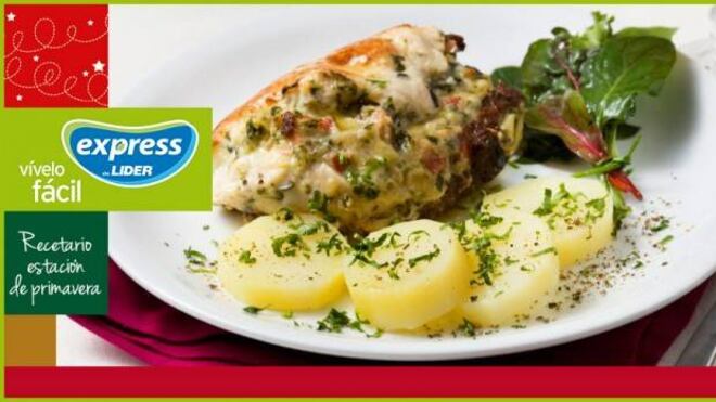 - Distribuir el relleno entre las pechugas de pollo. Enrollar o doblar y amarrar con cordel de cocina.