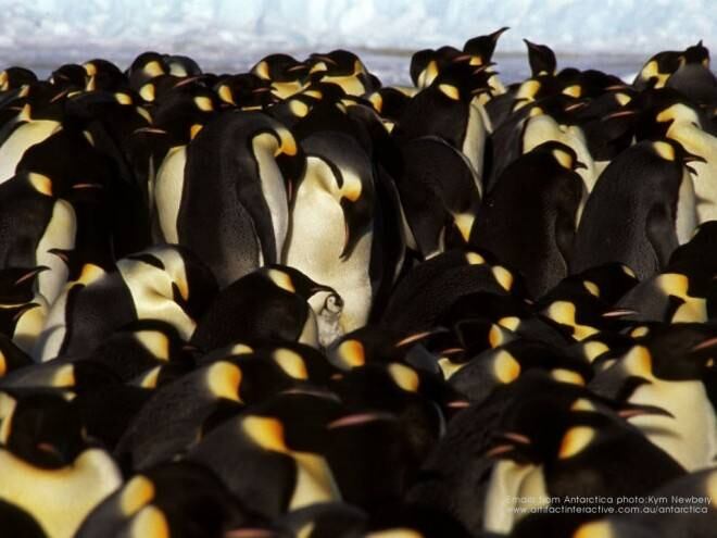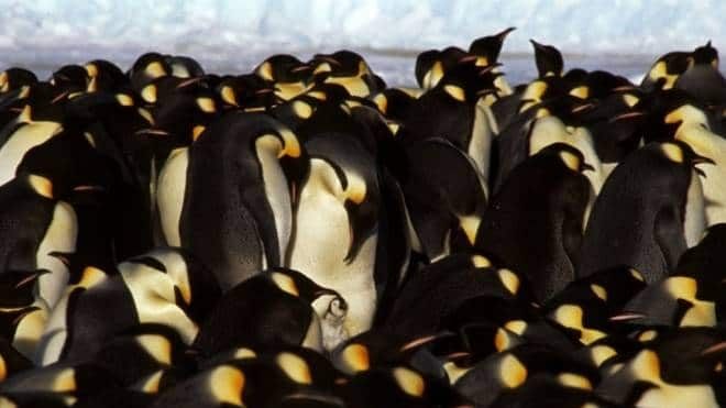 Como saben, los pingüinos emperador son la única especie que se reproduce en el invierno antártico. Los machos se apiñan no sólo para mantener su temperatura, sino para incubar los huevos. (Las hembras retornan al mar para alimentarse luego de poner sus huevos y una vez que nace la cría los padres se turnan para cuidarla).