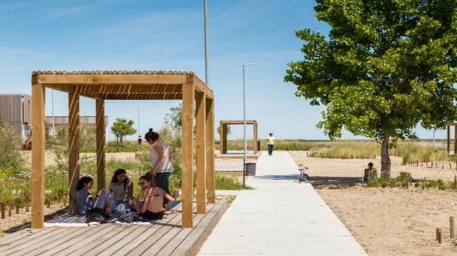 El proyecto consta de un espacio multifuncional de playa y 5,95 kilómetros de senderos peatonales que conectan las zonas urbanas y naturales. La red de caminos, hecha de bloques de hormigón, está rodeada de plantas que contrastan el Arenal. Por la noche, la zona está iluminada con energía 100% solar.