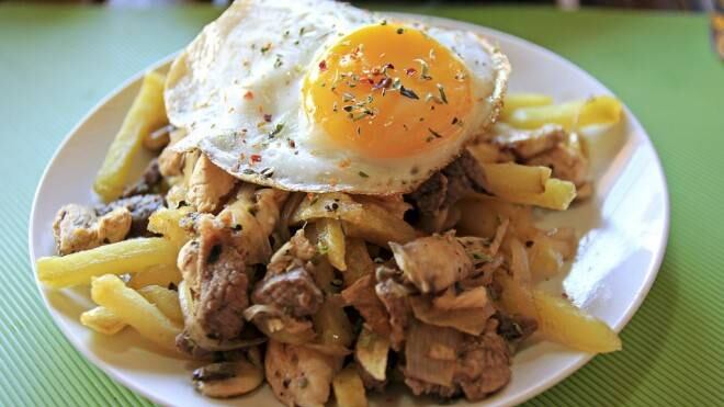 - Montar el plato dejando las papas fritas como base, la mezcla de cebolla, chorizo y carne encima y terminar con los huevos.