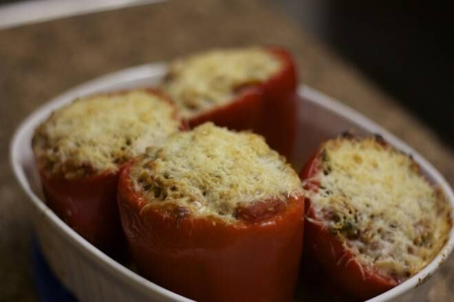 En un molde para hornear, coloca los pimientos cortados longitudinalmente. Añade toda la mezcla a los pimientos y vierte la 1/2 taza de caldo de pollo restante en la parte inferior. Cubre con papel aluminio y hornea por 35 minutos.