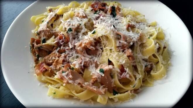 - ½ k (1 lb) de fettucini cocidos al dente