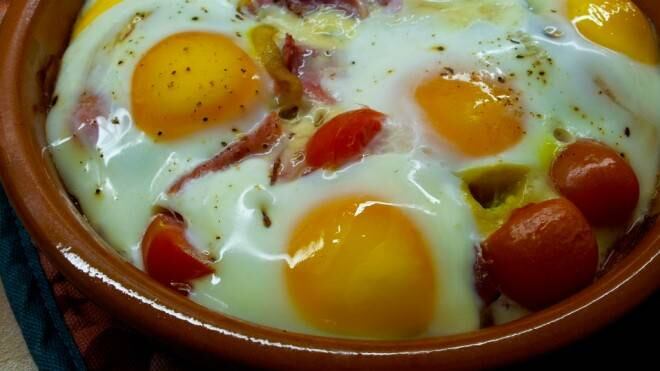 - Cuando ya se doraron, sácalos del sartén y colócalos en una fuente para el horno. Luego, agrega los tomates cherry cortados a la mitad, el jamón cortado en cubos y los huevos repartidos por todo el recipiente.