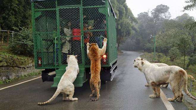 Un nuevo concepto de zoológico es el que exhibe la ciudad china de Chongqing. En el establecimiento, los animales circulan libre por un parque mientras que los visitantes se enjaulan en un vehículo para visitarlos. El camión que transporta a los turistas, está rodeado de presas de pollo, con el fin de atraer a los animales lo más cerca posible de las personas.