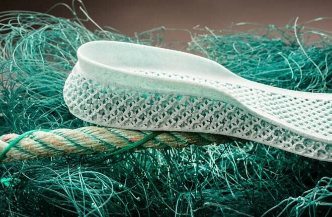 La parte blanca de la zapatilla es de tereftalato de polietileno, un tipo de plástico que se utiliza para botellas de plástico o textiles y para el resto del diseño (parte verde-azulada) se usa mallas de pesca.