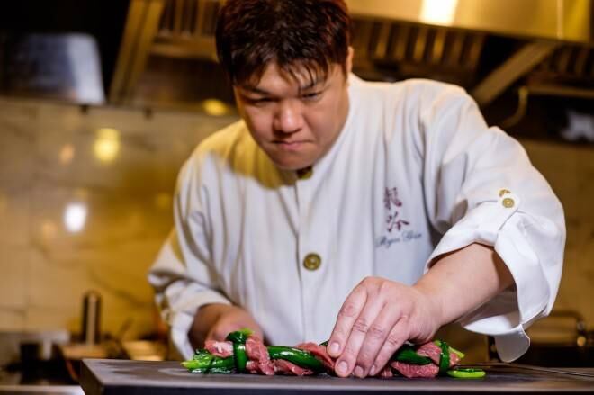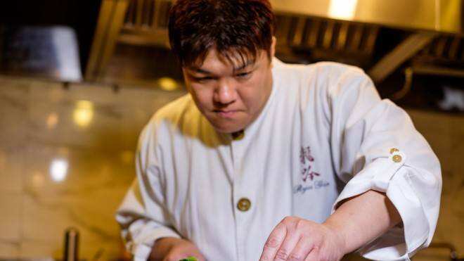 Sus preparaciones han sido descritas como una combinación de cocina tradicional japonesa y gastronomía molecular. En este video lo veremos en acción preparando “Akamutsu a la brasa al estilo escamas del dragón”. Primero, quita las escamas y las reserva. Lo que viene luego es cortar la cabeza, para después quitar cuidadosamente la médula espinal y filetear la carne.