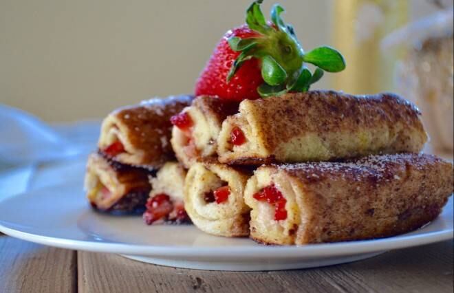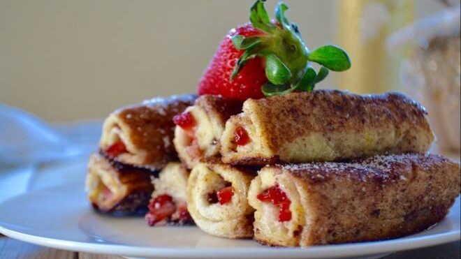 Rollitos de tostadas francesas rellenos de frutilla y nutella