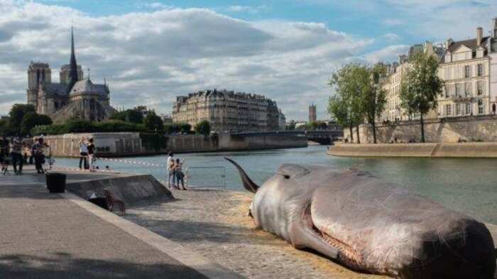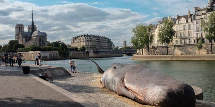 El colectivo de artistas belgas “Captain Boomer” sorprendió con una obra artística donde hicieron “encallar” una ballena en el borde del río Sena, en París. La intervención sorprendió a los parisinos por el impacto que significó ver una ballena de esas dimensiones a un costado del río y a pocos metros de la catedral de Notre Dame.